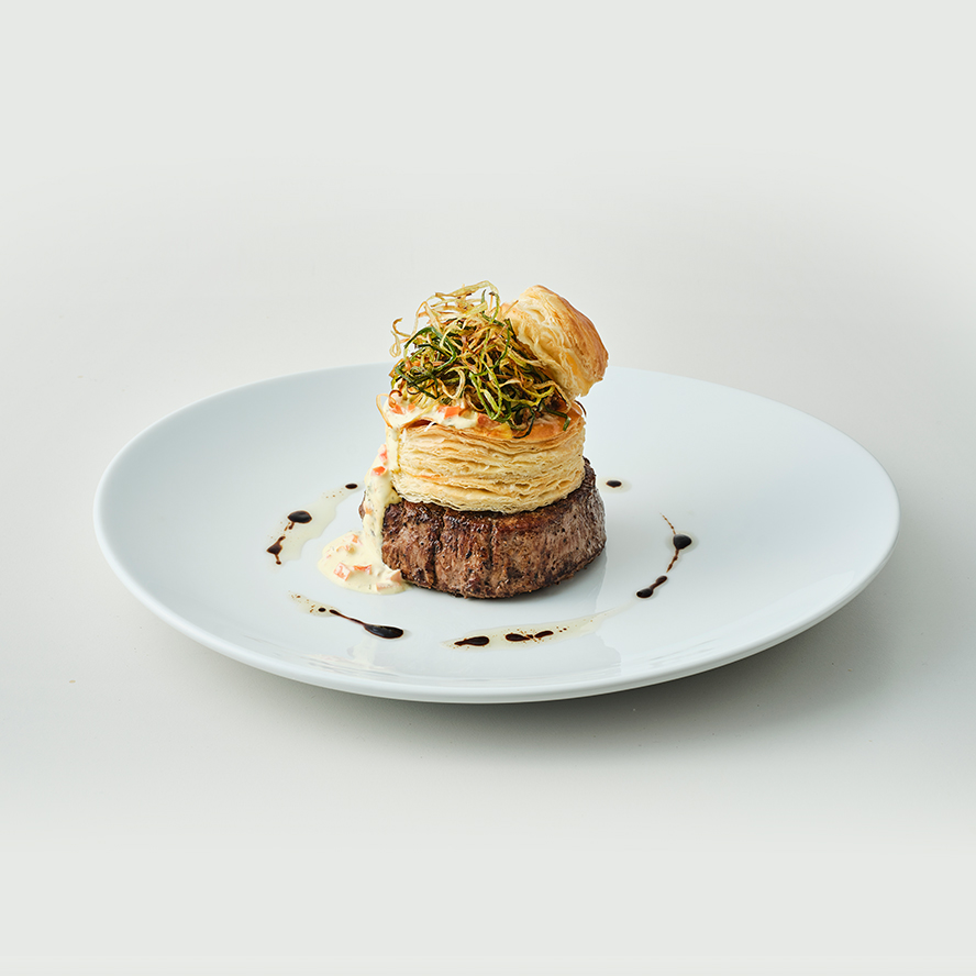 안심 스테이크 위에 머쉬룸 스프레드를 속을 채운 페이스트리를 올려 바삭함과 부드러움을 동시에 즐길 수 있는 스테이크입니다!~