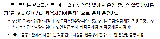 2024년 9월 2일부터 변경 사항: 기존에 각각 운영되던 압류방지통장이 ‘행복지킴이 통장’으로 통합되어 이제는 하나의 통장으로 모든 복지 급여를 수령할 수 있습니다.