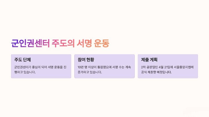 특히, 군인권센터는 이번 서명 운동을 통해 재구속의 정당성과 필요성을 제기하고 있으며, 4월 21일까지 목표 인원 10만 명의 서명을 받아 재판부에 제출할 계획입니다.