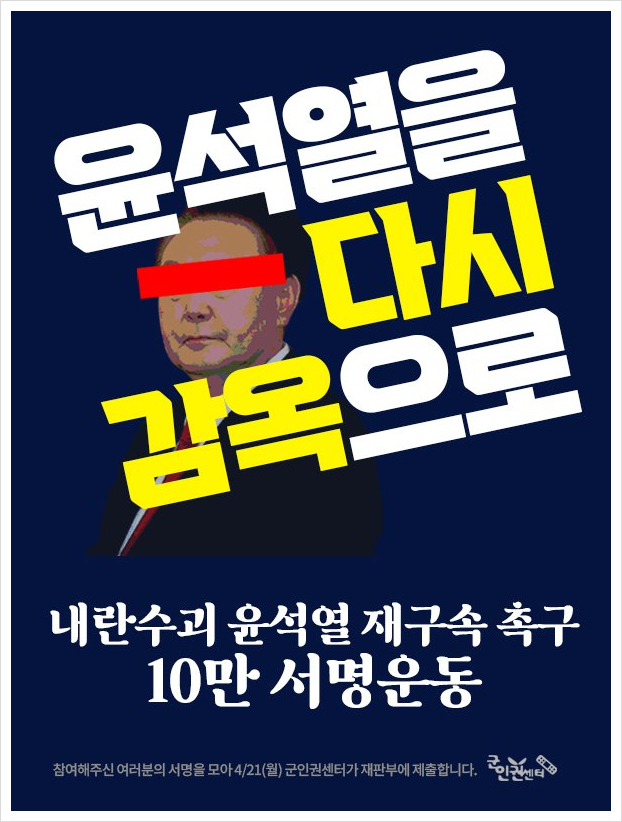 2025년 4월 14일, 군인권센터는 윤석열 전 대통령의 재구속을 촉구하는 ‘긴급 10만인 서명’ 운동을 시작했는데요. 이번 서명운동은 내란 혐의로 기소된 윤 전 대통령이 불구속 상태에서 재판을 받게 된 데 대한 시민사회의 반응으로 주목받고 있습니다.